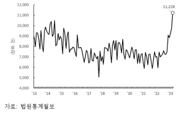 20일 법원이 공개한 ‘법원통계월보’ 통계에 따르면, 3월 개인회생사건 접수는 전년동월(7455건) 대비 50.6% 급증한 1만1228건을 기록했다고 보도가 나왔다.