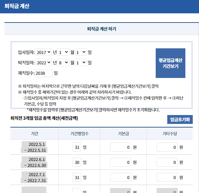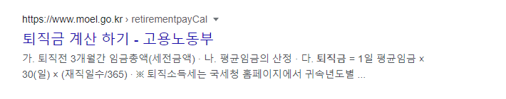 ☞ 퇴직금 산정공식은 다음과 같으며, 고용노동부 퇴직금 계산기 바로가기에서 계산할 수 있습니다.