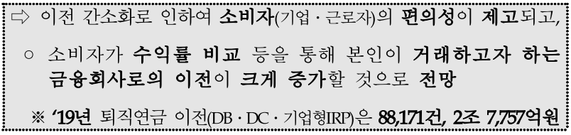 퇴직연금 이전절차 간소화로 기업과 근로자 등 퇴직연금 소비자의 편의성이 제고될 것으로 보고,소비자가 수익률 비교 등을 통해 본인이 거래하고자 하는 금융회사로의 이전이 크게 증가할 것으로 전망된다.