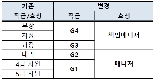 호칭은 매니저(G1~G2), 책임매니저(G3~G4)로 단순화했다.