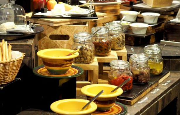 조식 뷔페는 육류, 샐러드, 토스트, 과일 등 호텔식으로 구성되었으며, 가격은 2000원이다.