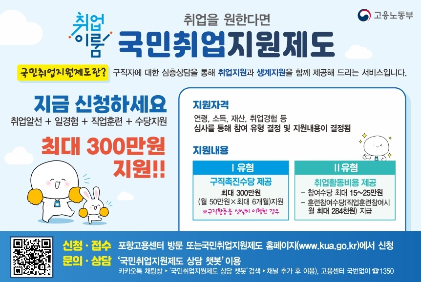 - 1유형 : 취업지원서비스 참여 등 구직활동의무 이행을 전제로 최저생계 보장을 위한 구직촉진수당(50만원x6개월) 지급