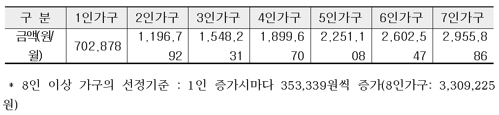 이것 말고도 긴급복지지원, 장애아동수당, 보육료지원 등 각종 사회복지제도의 대상자를 선정하는 기준이 되는 것이 바로 최저생계비입니다.