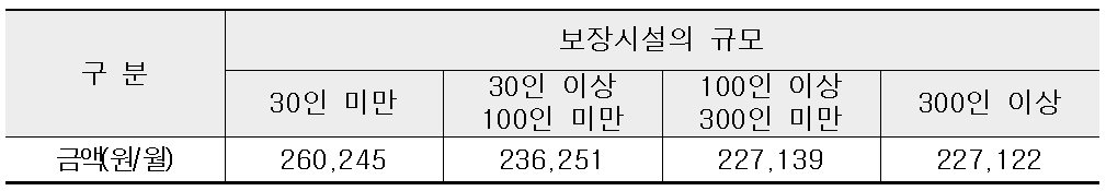 보장시설 생계급여의 수급자1인당 최저보장수준은 보장시설 규모별로 아래의 금액