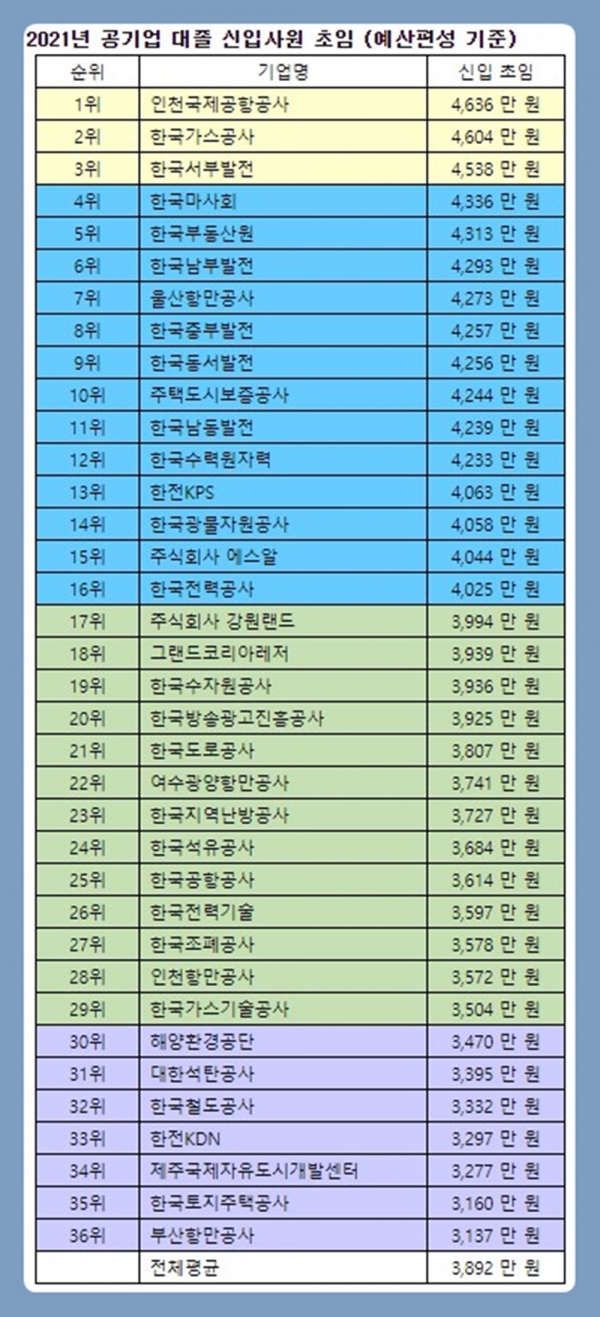 먼저 이들 공기업의 올해 대졸 신입사원 초임은 평균 3892만원이었다.