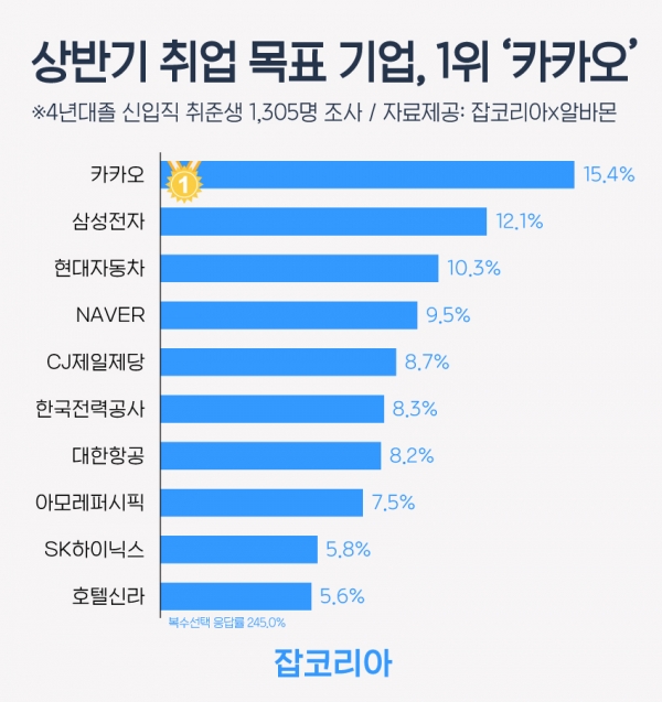 취업 플랫폼 잡코리아(www.jobkorea.co.kr)는 알바몬과 함께 갤럽에 의뢰, 올해 상반기 신입사원으로 취업을 준비하는 4년제 대졸 학력의 취준생 1305명을 대상으로 ‘상반기 취업 목표 기업’을 조사해 발표했다.