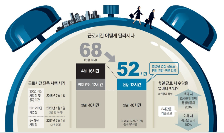 노동시간을 주 최대 68시간에서 52시간으로 단축하고 특례업종을 축소하는 내용을 담은 ‘근로기준법’ 개정안이 2018년 2월 국회를 통과하면서 2018년 7월 1일 부로 주52시간 근무제가 단계적으로 시행되고 있습니다.