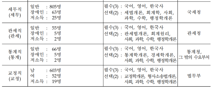 2022년부터는 고교과목이 폐지되며 행정법, 행정학, 세법, 회계 등 각 직렬별 전문과목이 필수과목이 된다.