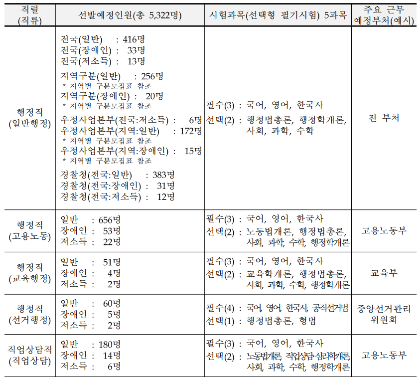 9급 국가공무원시험의 직렬별 채용인원은 행정직에선
