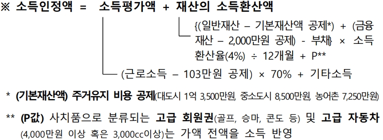 소득인정액은 소득 평가액과 재산의 소득환산액을 합산한 금액으로, 소득은 근로 ․ 사업 ․ 재산 ․ 공적이전소득 등을 반영하고, 재산은 일반재산·금융재산 등을 반영 됩니다.