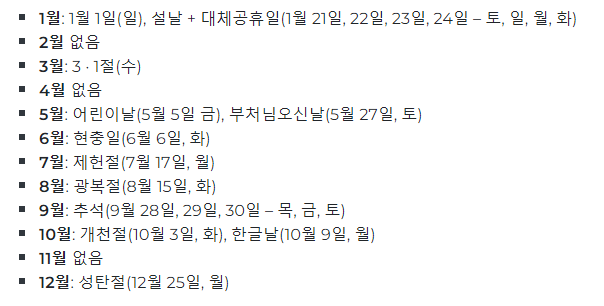 특히대체공휴일을 이용하면 여행이나 휴식을 오랫동안 취할 수 있는 장점이 있다.