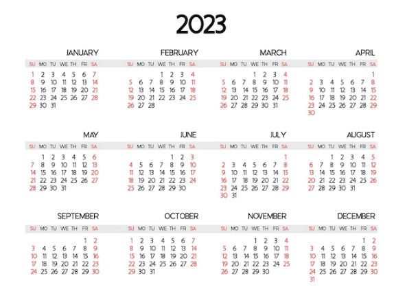 2023년 달력의 적색표기일인 관공서의 공휴일로는 53일의 일요일과 국경일, 설날 등 16일의 공휴일을 더해 총 69일이 있다.