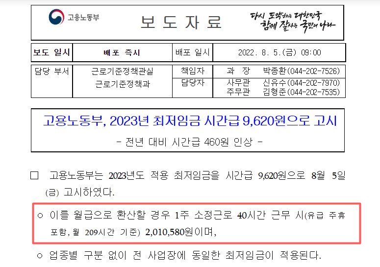 2023년 최저임금은 9,620원으로 올해(9,160원) 대비 460원 인상(5.0% 인상)됐습니다.