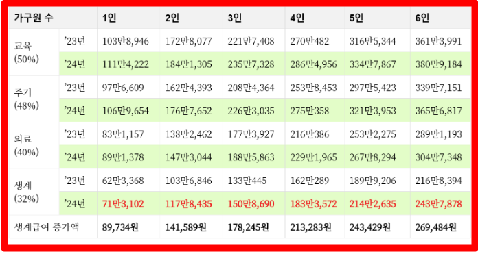 2024년도 기초생활 수급자 생계급여는 중위소득 32%로 상향되면서 소득 기준액과 급여액이 대폭 인상되었습니다.