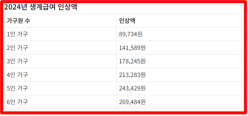 1인 가구는 89,734원, 2인는 가구 141,589원, 3인 가구는 178,245원가 각각 인상되었습니다.