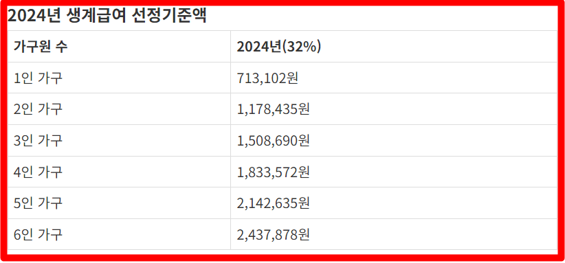 2024년도 기초생활 수급자 생계급여는 중위소득 32%로 상향되면서 소득 기준액과 급여액이 대폭 인상되었습니다.
