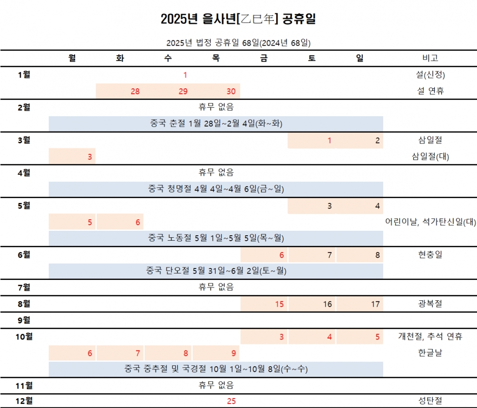 올해 법정공휴일은 지난해와 동일한 68일입니다.