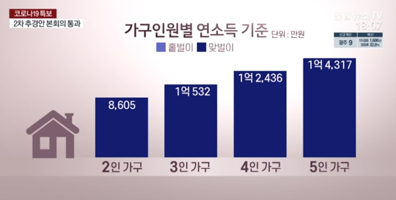 맞벌이 2인 가구는 홑벌이 3인 가구에 준해서, 맞벌이 3인 가구는 홑벌이 4인 가구에 준해서 소득기준을 적용하는 식이다.