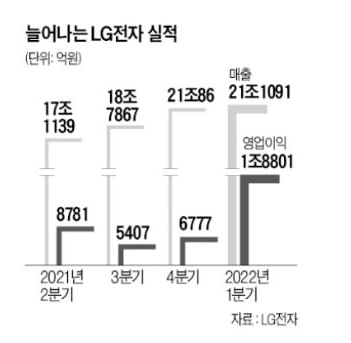 LG전자는 올해 1분기 매출 21조1091억원, 영업이익 1조8801억원을 거둔 것으로 잠정 집계됐다.