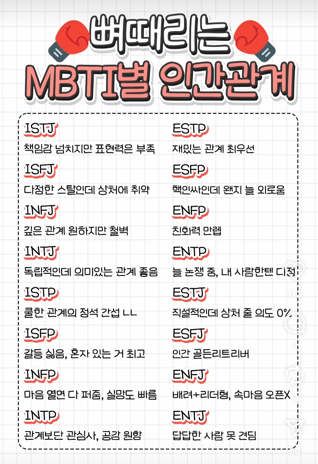 요즘 SNS에서 화제가 된 “뼈때리는 MBTI 인간관계 특징”을 한눈에 보기 쉽게 정리했습니다.
