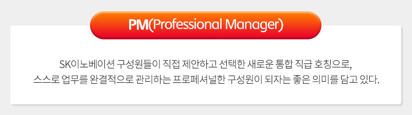 SK이노베이션의 통합된 새 호칭은 바로 ‘PM(Professional Manager)’. 이 명칭은 구성원들에게 직접 공모를 받고, 구성원의 투표를 통해 선정됐다.
